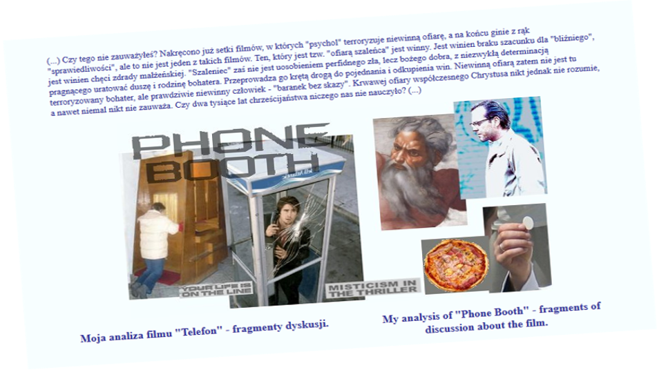 Father: While the "The Phone Booth" is not about confession, I can see how you could use it, though it does not pick up the mercy and compassion and freedom we now want to celebrate in that Sacrament. Other films with Confession or powerful confessional-type scenes that you could use, where the truth sets a person free: The Mission, Romero, Dead Man Walking, Philomena, Of Gods and Men, The Way. Yes, everyone says this film is not about confession. We want to see only "the friendly face" of God. I love St. sister Faustina and I read Diary many times: "Tell sinners that no one shall escape My Hand; if they run away from My merciful Heart, they will fall into My Just Hands." We are focusing on the Heart, but do we see Hands? And "lawyer", Paraclete? Maybe at all we forget that God is the Trinity... ... Trzeba spojrzeć na film Telefon przez te wszystkie przeciwieństwa do 1984. Jeszcze dwa. Pierwsze: spowiedź Winstona w 1984 jest nieprawdziwa, paniczna. On oczarniał wszystkich o wszystko, po prostu o cokolwiek mu przyszło do głowy byle by tylko zadowolić tego, kto go torturował. Spowiedź Stu jest zupełnie inna, prawdziwa. Stu przeczuwał, że ta spowiedź go nie uratuje. "Nie zrobiłem tego dla ciebie" - mówi torturującemu. Drugie przeciwieństwo: W filmie Telefon to torturujący podpowiada Stu, by zrzucił karę na kogoś innego. Podpuszcza, próbuje, ma to swój hiobowy wyraz. Natomiast w książce Orwella torturujący wcale nie podpowiada Winstonowi jak ma się uratować. W decydującym momencie to Winston sam dochodzi do tego wniosku: "Jednakże wydobył się z mroku, unosząc ze sobą zbawienną myśl. Był to jeden, jedyny sposób ratunku. Musi odgrodzić się od szczurów ciałem innego człowieka." A w chwilę później kontynuacja tej myśli: "I wówczas - nie, nie była to ulga, lecz nadzieja, zaledwie iskierka nadziei. (...) Ale nagle zrozumiał, że na całym świecie istnieje tylko jedna osoba, na którą może przenieść tę straszliwą torturę - jedno ciało, którym może się zasłonić przed szczurami. I zaczął wrzeszczeć jak opętany, powtarzając w kółko: Jak można mówić o Bogu takim językiem jaki jest w tym filmie? I co z Bogiem ma wspólnego wizja Stalinizmu w "1984"? Szczerze powiedziawszy sam zadałem te pytania, by sam sobie odpowiedzieć... Gdy mówimy o Bogu innym ludziom to się to nazywa "ewangelizowanie". Ewangelizujemy językiem kulturalnym, niecodziennym, a dla wielu ludzi - językiem obcym. Kiedy jednak Bóg mówi o sobie do nas to jest to "mistyka". Bóg nie mówi do nas językiem sztucznym. On przemawia do nas językiem takim, jakim my normalnie mówimy czyli pełnym "fucków". Autentyczność bohatera "Telefonu" jest wielką siłą tego filmu.
