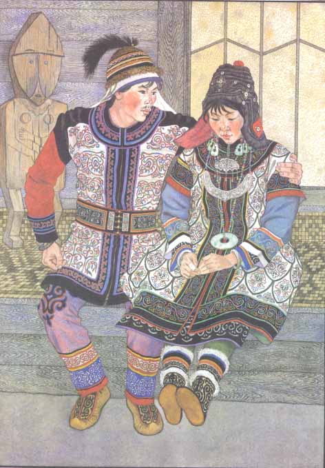 The main traditional employment - fishery which was combined with hunting. A fish extracted the year round. The surprising originality of nanaian traditional culture/as well as all Amur peoples / will consist in wide use of the processed fish skins for manufacturing clothes and utensils/see ris./.Nanajskie men were able to do all for the facilities: fished, hunted, constructed dwellings, did boats, narty, hooks, spears, ornaments, networks, traps. Women fished, when men left on hunting, dried meat and a fish, processed skins of animals and leather of fishes. SHili from them and also from fabrics headdresses, clothes and footwear for all family, produced berestjanuju and wum utensils. Traditional vehicles - narty, boats, skis. It was used dog uprjazhka, each family held till 10-12 draught dogs. Clothes - halatoobraznaja, from a fabric, the fish leather, rough suede/ровдуги/. The food basically has consisted of a fish. Religious beliefs: animizm and shamanizm. Nanaians had sports, dances, songs. Nanaians have rich folklore. Nanaians decorated all things a rich ornament.