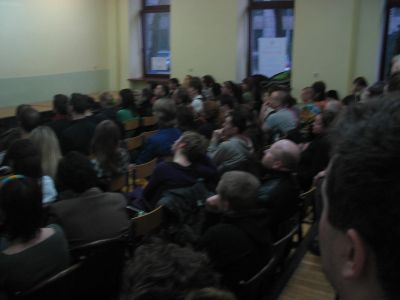 | Publiczność dopisała. Sala była prawie pełna. Po projekcji filmu był poczęstunek z potraw syberyjskich. Zgłodniałych studentów nie trzeba było namawiać do skosztowania - w kilka chwil stoły stały puste. Na koniec był pokaz śpiewu alikwotowego na żywo - w wykonaniu Przemysława Lenkiewicza - oraz fragmenty filmu śpiewaków z Tuwy. | ![]() |